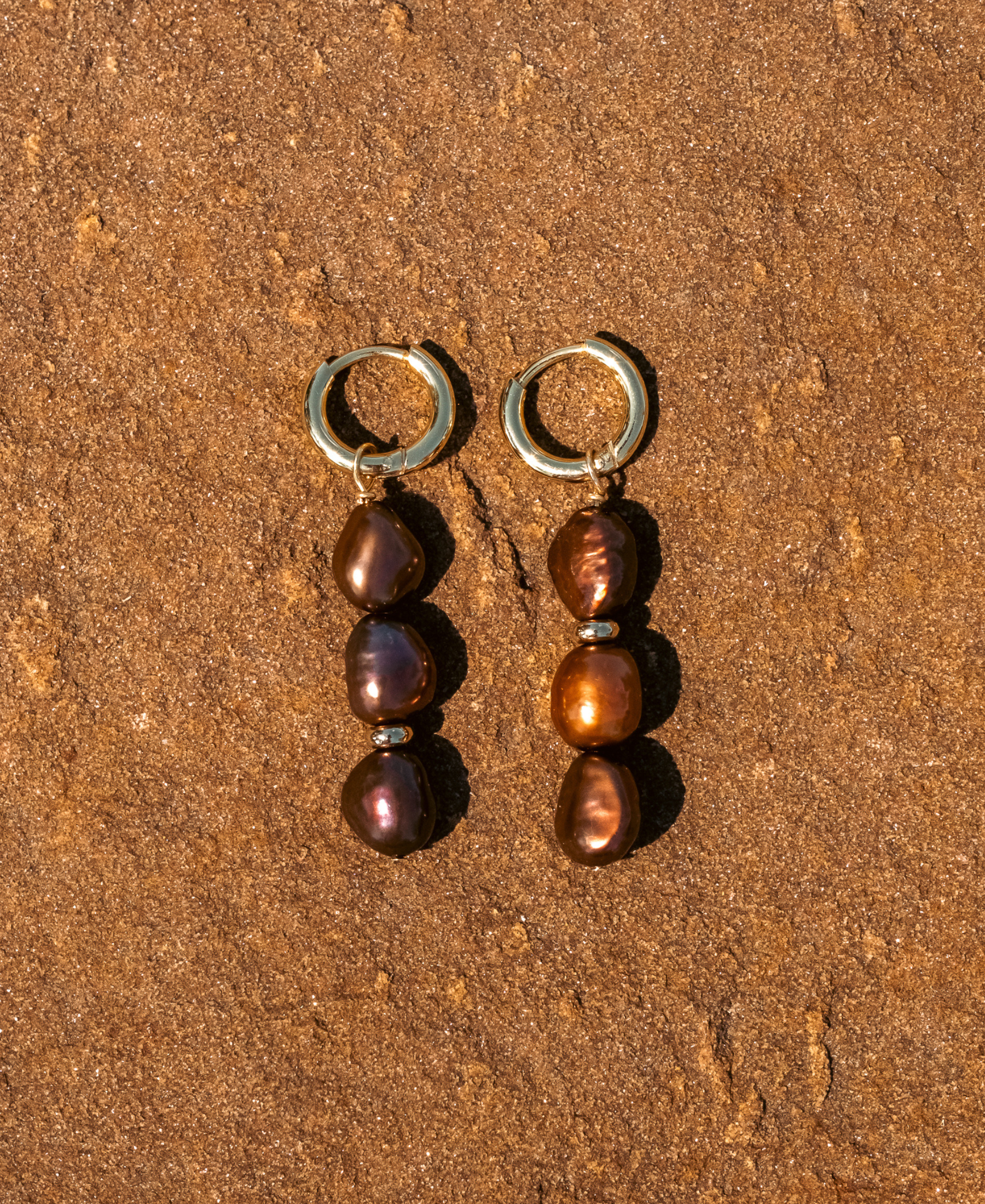 The Aria Earrings feature luminous freshwater pearls in stunning bronze and copper tones, paired with a huggie hoop. Inspired by the warm, earthy hues of desert landscapes, these earrings embody natural beauty and refined elegance, making them a standout addition to your jewelry collection.