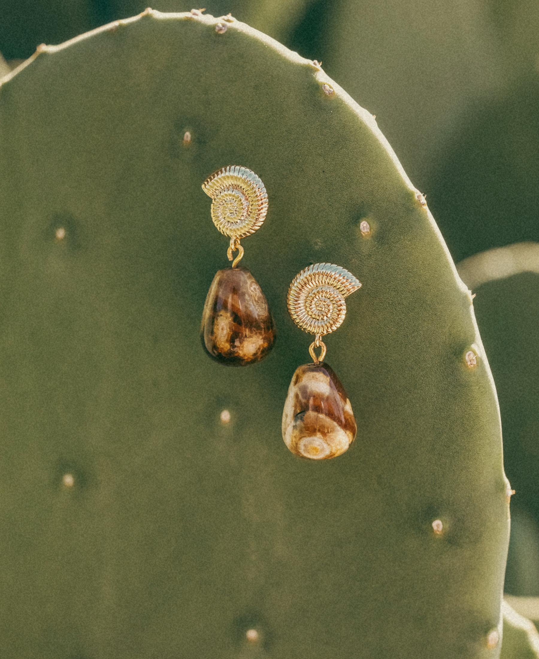 The Jade Earrings feature teardrop-shaped ocean jade stones, gracefully suspended from intricate gold spiral posts. These earrings combine earthy elegance with artistic design, adding a unique and organic flair to any outfit.