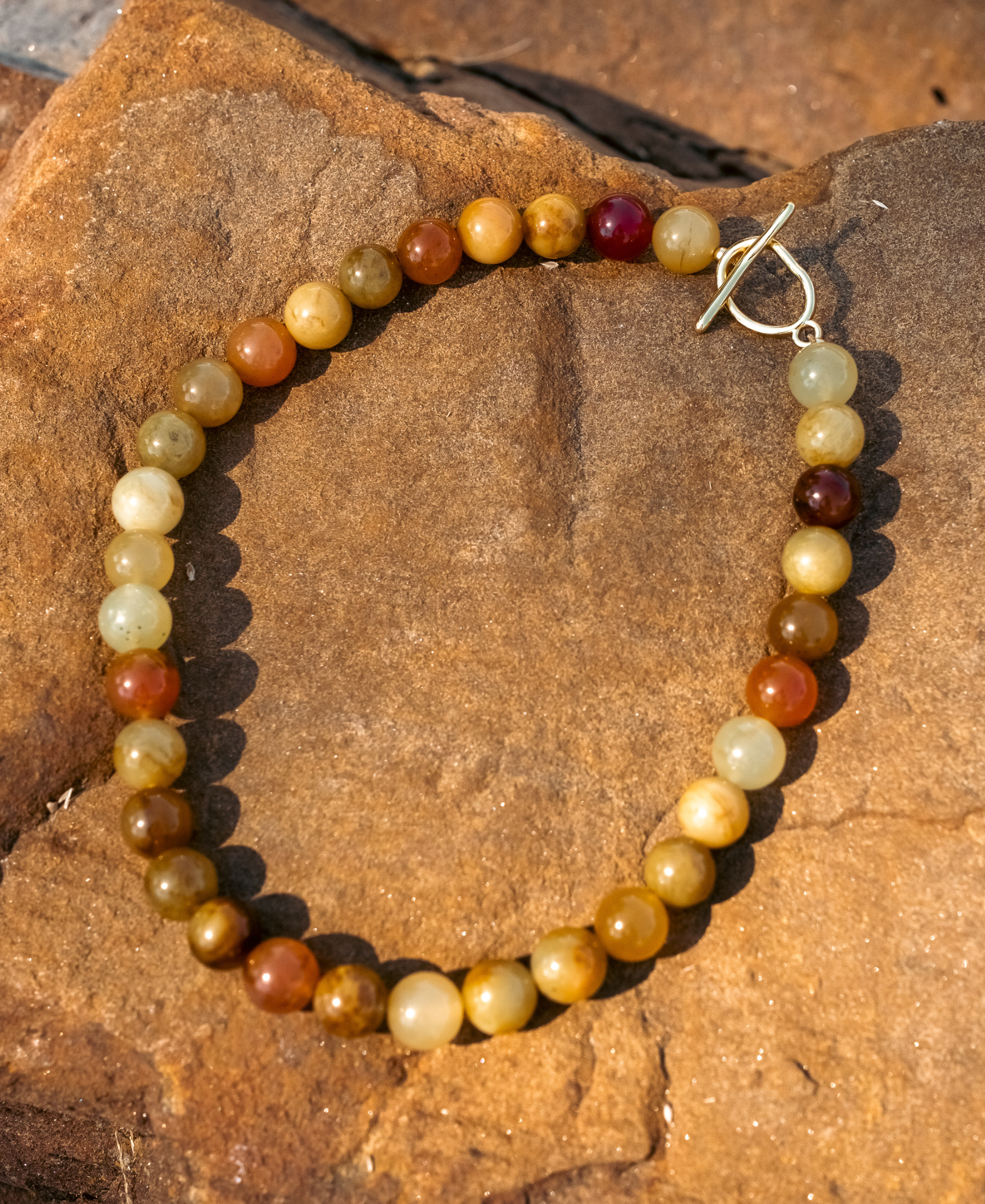 The Aurélie Necklace celebrates organic elegance, inspired by the beauty of nature. Featuring a harmonious blend of natural stones in earthy tones, each bead tells a unique story. Finished with a sleek gold toggle clasp, this timeless design offers effortless sophistication.