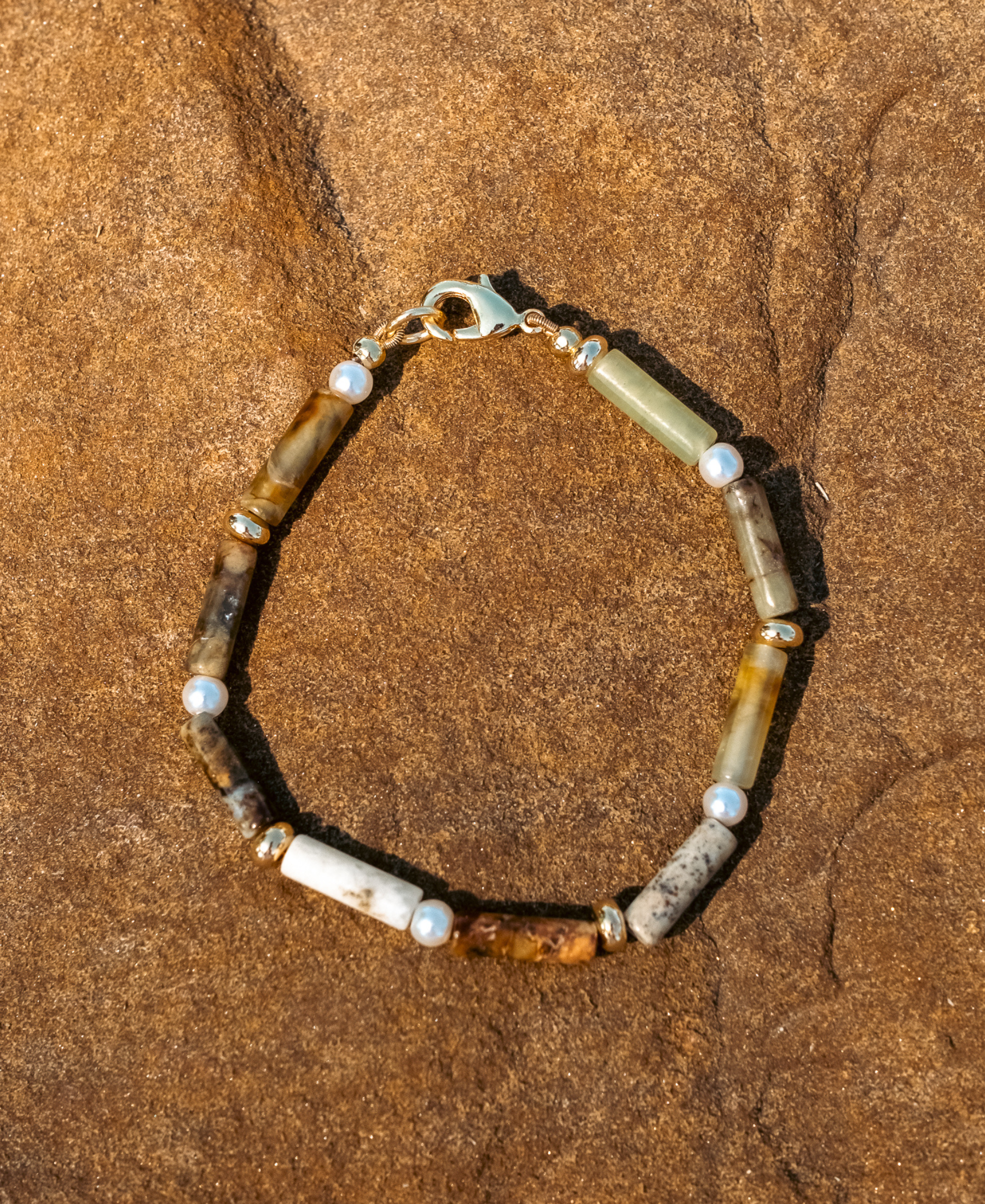 The Sage Bracelet features an exquisite combination of earthy-toned tubular stones and delicate freshwater pearls, accented with gold details. This elegant piece seamlessly blends organic elements with sophistication, making it a perfect choice for everyday wear with a natural twist.